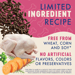 Pups of all life stages love the soft and chewy, bite-sized flavor in our #1 ingredient Turkey training bites, made with all-natural hormone and antibiotic-free proteins. With 3 calories or less per treat, you'll love treating them to healthy, easy-to-digest treats filled with ingredients that will help them thrive.
