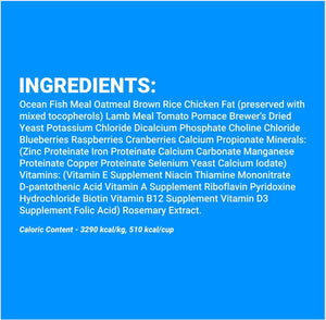 Ocean Fish Meal Oatmeal Brown Rice Chicken Fat (preserved with mixed tocopherols) Lamb Meal Tomato Pomace Brewer's Dried Yeast Potassium Chloride Dicalcium Phosphate Choline Chloride Blueberries Raspberries Cranberries Calcium Propionate Minerals: (Zinc Proteinate Iron Proteinate Calcium Carbonate Manganese Proteinate Copper Proteinate Selenium Yeast Calcium Iodate) Vitamins: (Vitamin E Supplement Niacin Thiamine Mononitrate D-pantothenic Acid Vitamin A Supplement Riboflavin Pyridoxine Hydrochloride Biotin Vitamin B12 Supplement Vitamin D3 Supplement Folic Acid) Rosemary Extract.