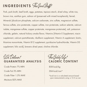 Pork, Pork Broth, Beef Broth, Eggs, Potatoes, Tapioca Starch, Dried Whey, White Rice, Brown Rice, Xanthan Gum, Salmon Oil (preserved with mixed tocopherols),Fennel, Minerals [Dicalcium Phosphate, Calcium Carbonate, Zinc Sulfate, Magnesium Sulfate, Ferrous Sulfate, Zinc Proteinate, Copper Sulfate, Iron Proteinate, Sodium Selenite, Calcium Iodate, Manganese Sulfate, Copper Proteinate, Manganese Proteinate], Salt, Potassium Chloride, Gelatin, Natural Hickory Smoke Flavor, Vitamins [Vitamin E Supplement, Niacin Supplement, Calcium Pantothenate, Riboflavin Supplement, Vitamin A Supplement, Biotin, Thiamine Mononitrate, Vitamin B12 Supplement, Pyridoxine Hydrochloride, Vitamin D3 Supplement, Folic Acid],Brewers Dried Yeast, Choline Chloride.