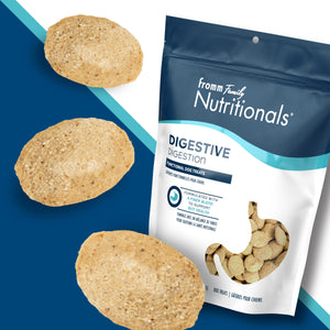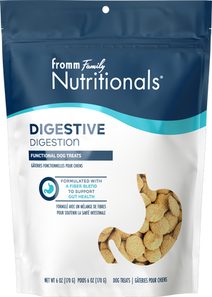 Crunchy dog treats containing a specialized fiber blend of pumpkin, psyllium seed husk, and ground miscanthus grass to support healthy digestion and overall digestive health.
