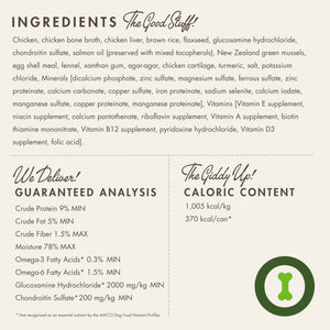 Chicken, Chicken Bone Broth, Chicken Liver, Brown Rice, Flaxseed, Glucosamine Hydrochloride, Chondroitin Sulfate, Salmon Oil (preserved with mixed tocopherols), New Zealand Green Mussels, Egg Shell Meal, Fennel, Xanthan Gum, Agar-Agar, Chicken Cartilage, Turmeric, Salt, Potassium Chloride, Minerals [Dicalcium Phosphate, Zinc Sulfate, Magnesium Sulfate, Ferrous Sulfate, Zinc Proteinate, Calcium Carbonate, Copper Sulfate, Iron Proteinate, Sodium Selenite, Calcium Iodate, Manganese Sulfate, Copper Proteinate, Manganese Proteinate], Vitamins [Vitamin E Supplement, Niacin Supplement, Calcium Pantothenate, Riboflavin Supplement, Vitamin A Supplement, Biotin, Thiamine Mononitrate, Vitamin B12 Supplement, Pyridoxine Hydrochloride, Vitamin D3 Supplement, Folic Acid].