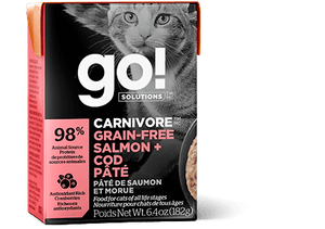 GO! CARNIVORE Grain Free Salmon + Cod Pâté is formulated to meet the nutritional levels established by the AAFCO Cat Food Nutrient Profiles for All Life Stages.