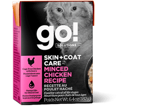 For healthy skin, a shiny coat & a new attitude! Our GO! SKIN + COAT CARE Minced Chicken with Gravy Recipe is carefully prepared with all the nutrients your cat requires including premium quality cage-free chicken which provides your cat with essential amino acids for strong muscles, while omega oils help maintain healthy skin and a shiny coat, helping to reduce shedding.