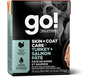 For healthy skin, a shiny coat & a new attitude! Our GO! SKIN + COAT CARE Turkey + Salmon Pate Recipe is carefully prepared with all the nutrients your dog requires including premium quality cage-free turkey & premium quality salmon which provides your dog with essential amino acids for strong muscles, while omega oils help maintain healthy skin and a shiny coat.