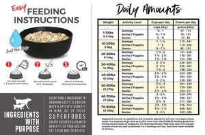 Chicken, Chicken Liver, Oats, Flax, Carrots, Coconut, Kale, Cranberry, Turmeric, Ginger, Vitamin A Supplement, Vitamin D3 Supplement, Vitamin E Supplement, Niacin Supplement, Iron Proteinate, Calcium Carbonate, Phosphorus, Zinc Proteinate, Riboflavin Supplement, Thiamine Mononitrate, Potassium Chloride, Manganese Proteinate, Copper Proteinate, Magnesium Chloride, Pyridoxine Hydrochloride, Vitamin B12 Supplement.