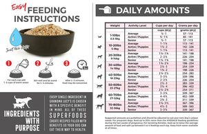 The suggested daily amounts should be adjusted to suit your own dog's unique nutritional requirements and appetite, which may vary according to age and level of activity. Keep fresh water available at all times. Store in a cool dry place.For each cup of Grandma Lucy's Artisan, add 1 to 1-1/2 cups of warm water. Stir well and let stand for 3-5 minutes. After 3-5 minutes, food may be consumed. Leftover food may be refrigerated for up to 48 hours. The 3 lb. bag makes 17 lbs. of fresh food. The 10 lb. bag makes 55 lbs. of fresh food.
