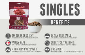 The perfect snack to satisfy their hunger! There are no corners cut when it comes to our freeze-dried Singles Treats. Made with high-quality meat such as whole, white meat chicken breasts or line-caught pollock filets, our single-source protein treats differ from the rest. They are freeze-dried to perfection giving your pet that gentle crunch they love. Give them as is for a special treat or break them up for a smaller bite while training no matter how your furry kid gets them from you, every treat time is guaranteed to be a mouth-watering experience.