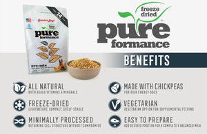 Pureformance is packed with a punch containing only the best ingredients to give them that liveliness they need for all that walking, hiking, and fun. This food is a whole new approach to freeze-dried pet food. Our delicious selection of unique proteins are accompanied by highly nutritious chickpeas, fruits, and vegetables. Chickpeas are full of flavor and a rich source of dietary fiber and protein allowing energy to be released slowly for a consistent energy level. Grandma Lucy's Pureformance uses simple ingredients to bring your pet the best simple nutrition in one convenient bag that will get your pet jumping for joy (literally)!