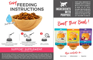Does your pet need a little extra boost? Grandma Lucy's believes that a healthy pet starts with healthy foods. Every single ingredient in our foods, treats, and support options are chosen with a special benefit in mind. In our Pumpkin Pouches, all of these specifically selected superfoods are blended together to create a healthy addition to your pet's food. Sprinkle some on their food or mix it with some water for a little mid-day treat. However they get it, Pumpkin Pouches are filled with benefits so your pet can eat their way to health.