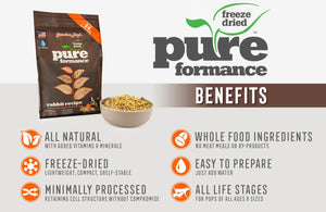 Pureformance is packed with a punch containing only the best ingredients to give them that liveliness they need for all that walking, hiking, and fun. This food is a whole new approach to freeze-dried pet food. Our delicious selection of unique proteins are accompanied by highly nutritious chickpeas, fruits, and vegetables. Chickpeas are full of flavor and a rich source of dietary fiber and protein allowing energy to be released slowly for a consistent energy level. Grandma Lucy's Pureformance uses simple ingredients to bring your pet the best simple nutrition in one convenient bag that will get your pet jumping for joy (literally)!