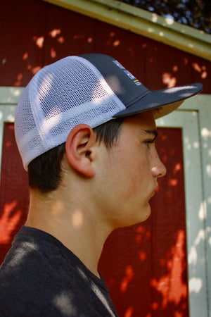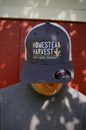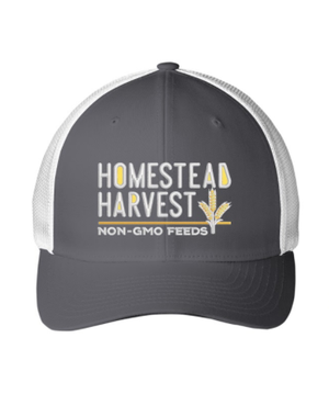 When sunglasses are missing in action, a hat can keep the sun out of your eyes just as nicely! Our grey and white Homestead Harvest hat is super comfy, flexible, and keeps you cool. The mesh material of the hat keeps air flowing around your head, so no unwanted heat or sweat gets trapped under the hat. By donning this hat you are supporting our 7th generation family farm. We are also the proud producer of Homestead Harvest. A brand of Non-GMO feeds, packed with omega 3’s, whole grains, nutrients, and vitamins. In addition, we strive to protect our local ecosystem by employing no-till cropping, cover crops, riparian buffer zones, and many more management practices. By wearing this hat you’re supporting a local family-owned business in the great state of Maryland!