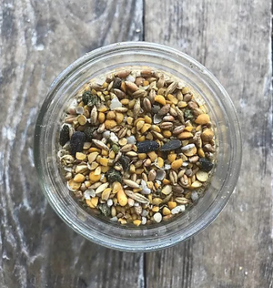 corn, roasted soybeans, wheat, alfalfa meal, black oil sunflowers, oyster shells,