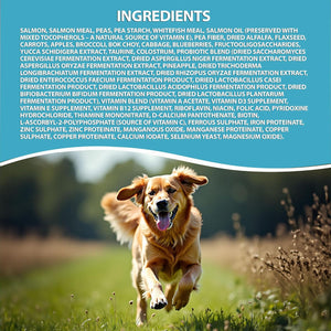 SALMON, SALMON MEAL, PEAS, PEA STARCH, WHITEFISH MEAL, SALMON OIL (PRESERVED WITH MIXED TOCOPHEROLS), PEA FIBRE, DRIED ALFALFA, FLAXSEED, CARROTS, APPLES, BROCCOLI, BOK CHOY, CABBAGE, BLUEBERRIES, FRUCTOOLIGOSACCHARIDES, YUCCA SCHIDIGERA EXTRACT, TAURINE, COLOSTRUM, DRIED SACCHAROMYCES CEREVISIAE FERMENTATION EXTRACT, DRIED ASPERGILLUS NIGER FERMENTATION EXTRACT, DRIED ASPERGILLUS ORYZAE FERMENTATION EXTRACT, PINEAPPLE, DRIED TRICHODERMA LONGIBRACHIATUM FERMENTATION EXTRACT, DRIED RHIZOPUS ORYZAE FERMENTATION, EXTRACT, PINEAPPLE, DRIED ENTEROCOCCUS FAECIUM FERMENTATION PRODUCT, DRIED LACTOBACILLUS CASEI FERMENTATION PRODUCT, DRIED LACTOBACILLUS ACIDOPHILUS FERMENTATION PRODUCT, DRIED BIFIOBACTERIUM BIFIDUM FERMENTATION PRODUCT, DRIED LACTOBACILLUS PLANTARUM FERMENTATION PRODUCT, VITAMIN A ACETATE, VITAMIN D3 SUPPLEMENT, VITAMIN E SUPPLEMENT, VITAMIN B12 SUPPLEMENT, RIBOFLAVIN, NIACIN, FOLIC ACID, PYRIDOXINE HYDROCHLORIDE, THIAMINE MONONITRATE, D-CALCIUM PANTOTHENATE, BIOTIN, L-ASCORBYL-2-POLYPHOSPHATE (SOURCE OF VITAMIN C), FERROUS SULPHATE, IRON PROTEINATE, ZINC SULPHATE, ZINC PROTEINATE, MANGANOUS OXIDE, MANGANESE PROTEINATE, COPPER SULPHATE, COPPER PROTEINATE, CALCIUM IODATE, SELENIUM YEAST, MAGNESIUM OXIDE. |