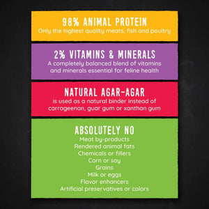Featuring limited-ingredient, simple recipes made from 100% animal protein and 0% grains. Each recipe of Hound & Gatos Canned Cat Food is grain free and formulated to help prevent common conditions including; feline kidney disease, liver failure and feline IBD. Made in the USA without the use of bi-products, fillers, artificial preservatives and carrageenan free. Made with all meat and no hidden chemicals in a tasty pate texture.