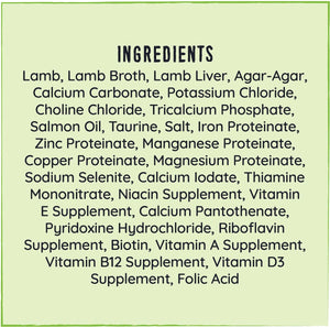Lamb, Lamb Broth, Lamb Liver, Agar-Agar, Calcium Carbonate, Potassium Chloride, Choline Chloride, Tricalcium Phosphate, Salmon Oil, Taurine, Salt, Iron Proteinate, Zinc Proteinate, Manganese Proteinate, Copper Proteinate, Magnesium Proteinate, Sodium Selenite, Calcium Iodate, Thiamine Mononitrate, Niacin Supplement, Vitamin E Supplement, Calcium Pantothenate, Pyridoxine Hydrochloride, Riboflavin Supplement, Biotin, Vitamin A Supplement, Vitamin B12 Supplement, Vitamin D3 Supplement, Folic Acid