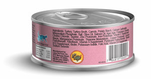 Turkey, Turkey Broth, Carrots, Potato Starch, Calcium Carbonate, Monosodium Phosphate, Salt, Olive Oil, Salmon Oil, Agar-Agar, Potassium Chloride, Choline Chloride, Taurine, Zinc Proteinate, Iron Proteinate, Vitamin E Supplement, Niacin, Manganese Proteinate, Thiamine Mononitrate, Copper Proteinate, Calcium Pantothenate, Riboflavin, Vitamin A Supplement, Pyridoxine Hydrochloride, Vitamin B12 Supplement, Biotin, Potassium Iodide, Folic Acid, Vitamin D3 Supplement, Sodium Selenite.