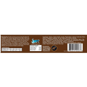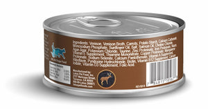 Venison, Venison Broth, Carrots, Potato Starch, Calcium Carbonate, Monosodium Phosphate, Sunflower Oil, Salt, Salmon Oil, Choline Chloride, Agar-Agar, Potassium Chloride, Taurine, Zinc Proteinate, Iron Proteinate, Niacin, Vitamin E Supplement, Thiamine Mononitrate, Copper Proteinate, Manganese Proteinate, Sodium Selenite, Calcium Pantothenate, Vitamin A Supplement, Riboflavin, Pyridoxine Hydrochloride, Biotin, Vitamin B12 Supplement, Calcium Iodate, Vitamin D3 Supplement, Folic Acid.