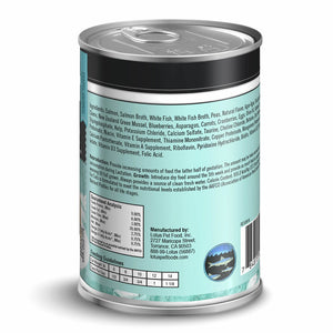 Salmon, Salmon Broth, White Fish, White Fish Broth, Peas, Natural Flavor, Agar-Agar, Tricalicum Phosphate, Clams, New Zealand Green Mussel, Blueberries, Asparagus, Carrots, Cranberries, Eggs, Olive Oil, Salmon OIl, Salt, Sodium Tripolyphosphate, Kelp, Potassium Chloride, Calcium Sulfate, Taurine, Choline Chloride, Betaine, Zinc Proteinate, Iron Proteinate, Niacin, Vitamin E Supplement, Thiamine Mononitrate, Copper Proteinate, Manganese Proteinate, Sodium Selenite, Calcium Pantothenate, Vitamin A Supplement, Riboflavin, Pyridoxine Hydrochloride, Biotin, Vitamin B12 Supplement, Calcium Iodate, Vitamin D3 Supplement, Folic Acid.