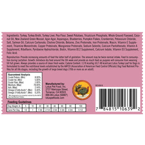 Lotus Turkey Loaf for Dogs is formulated to meet the nutritional levels established by the AAFCO (Association of American Feed Control Officials) Dog Nutrient Profiles for all life stages, including the growth of large breed dogs (70 lb or more as an adult).