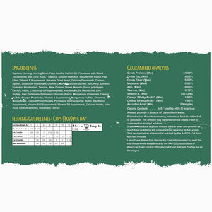Sardine, Herring, Herring Meal, Peas, Lentils, Catfish Oil (Preserved with Mixed Tocopherols and Citric Acid), Tapioca, Ground Flaxseed, Natural Fish Flavor, Pea Fiber, Vitamin E Supplement, Brewers Dried Yeast, Calcium Propionate, Carrots, Apples, Dicalcium Phosphate, Choline Chloride, Calcium Sulfate, Salt, Kelp, Spinach, Pumpkin, Blueberries, Taurine, New Zealand Green Mussels, Yucca Schidigera Extract, Inulin, L-Ascorbyl-2-Polyphosphate, Iron Sulfate, DL Methionine, Zinc Sulfate, Zinc Proteinate, Potassium Chloride, Niacin, Manganese Proteinate, Copper Sulfate, Copper Proteinate, Vitamin A Supplement, Manganese Sulfate, Thiamine Mononitrate, Calcium Pantothenate, Pyridoxine Hydrochloride, Biotin, Riboflavin Supplement, Vitamin B12 Supplement, Vitamin D3 Supplement, Calcium Iodate, Folic Acid, Sodium Selenite, Rosemary Extract.