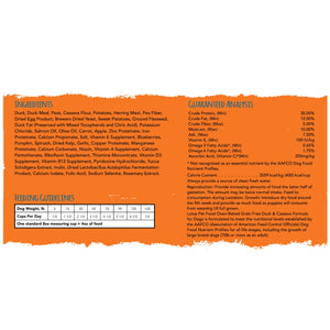 Duck, Duck Meal, Peas, Cassava Flour, Potatoes, Herring Meal, Pea Fiber, Dried Egg Product, Brewers Dried Yeast, Sweet Potatoes, Ground Flaxseed, Duck Fat (Preserved with Mixed Tocopherols and Citric Acid), Potassium Chloride, Salmon Oil, Olive Oil, Carrot, Apple, Zinc Proteinate, Iron Proteinate, Calcium Propionate, Salt, Vitamin E Supplement, Blueberries, Pumpkin, Spinach, Dried Kelp, Garlic, Copper Proteinate, Manganese Proteinate, Calcium Carbonate, Niacin, Vitamin A Supplement, Calcium Pantothenate, Riboflavin Supplement, Thiamine Mononitrate, Vitamin D3 Supplement, Vitamin B12 Supplement, Pyridoxine Hydrochloride, Yucca Schidegera Extract, Inulin, Dried Lactobacillus Acidophilus Fermentation Product, Calcium Iodate, Folic Acid, Sodium Selenite, Rosemary Extract.