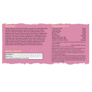Turkey, Turkey Liver, Dried Peas, Chickpeas, Cassava Flour, Dried Egg Product, Pea Fiber, Dried Sweet Potatoes, Brewers Dried Yeast, Herring, Calcium Carbonate, Dicalcium Phosphate, Whole Ground Flaxseed Meal, Calcium Propionate, Salt, Potassium Chloride, Carrots, Sweet Potatoes, Apples, Garlic, Choline Chloride, Olive Oil, Salmon Oil, Blueberries, Pumpkin, Spinach, Zinc Proteinate, Iron Proteinate, Vitamin E Supplement, Yucca Schidegera Extract, Dried Kelp, Dried Lactobacillus Acidophilus Fermentation Product, Inulin, Copper Proteinate, Manganese Proteinate, Niacin, Calcium Pantothenate, Sodium Selenite, Vitamin A Supplement, Riboflavin Supplement, Calcium Iodate, Vitamin B12 Supplement, Thiamine Mononitrate, Pyridoxine Hydrochloride, Vitamin D3 Supplement, Folic Acid, Rosemary Extract.