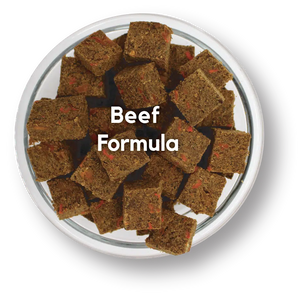 Beef, Sweet Potato, Garbanzo Beans, Beef Kidney, Beef Lung, Rice Bran, Water, Salt, Dried Carrots, Whole Dried Egg, Rice Flour, Calcium Flour, Beef Fat, Spinach, Glycerin, Lecithin, Natural Hickory Smoke, Dicalcium Phosphate, Taurine, Potassium Chloride, Celery Powder, Natural Flavor, Inulin, Kelp Meal, Brewer’s Yeast, Zinc Proteinate, Disodium EDTA, Potassium Sorbate (Preservative), Sodium Benzoate (Preservative), Vitamin E Supplement, Rosemary Extract, Iron Proteinate, Sodium Erythorbate (preservative), Ferrous Sulfate, Biotin, Copper Proteinate, Sodium Selenite, Niacin, D-Calcium Pantothenate, Manganous Oxide, Riboflavin, Vitamin A Acetate, Thiamine Mononitrate, Vitamin B12 Supplement, Pyridoxine Hydrochloride, Calcium Iodate, Vitamin D3 supplement, Folic acid.