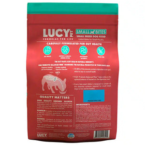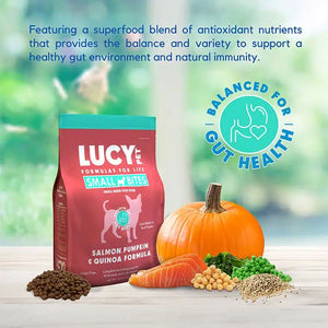 The Lucy Pet Salmon, Pumpkin & Quinoa Small Bites for Dogs is perfectly sized for smaller mouths. Fish is the only animal protein source, and the first ingredient is wild Alaskan salmon for delicious taste. This food contains no salmon byproducts. Chickpeas are rich in protein and complex carbs, pumpkin is a nutritional powerhouse with fiber and protein to support digestion, and quinoa is rich in protein and essential amino acids. This superfood blend of ingredients is naturally preserved. Plus, prebiotic balanced fiber helps promote an optimal digestive tract environment to help your furbaby absorb nutrients more efficiently, so she gets more out of every bite.