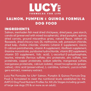 Lucy Pet Formulas for Life ™ Salmon, Pumpkin and Quinoa Formula Dog Food is formulated to meet the nutritional levels established by the AAFCO Dog Food Nutrient Profiles for maintenance, including the growth of large size dogs (70 lbs or more as an adult). Since our formula is complete and balanced, Lucy Pet recommends that you do not add vitamins, minerals, or any other supplements, except upon the advice of a veterinarian.