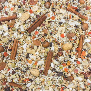 Safflower, Oats, Wheat, Apricots, Cinnamon Sticks, Pumpkin Seeds, Buckwheat, Cashews, Coconut, Roasted Garbanzo Beans, White Milo, Papaya, Flaked Peas, Pineapple, Bananas, Almonds, Roasted Soybeans, Hazelnuts, Dates, Cranberries, Dehydrated Black Beans, Dehydrated Kidney Beans, Brazil Nuts, Flaked Carrots, Apples, Green Peas, Sage, Algae Meal, Dried Enterococcus Faecium Fermentation Product, Dried Lactobacillus Acidophilus Fermentation Product, Dried Lactobacillus Casei Fermentation Product.Guaranteed Analysis