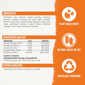 Pumpkin, pea protein, sweet potato, coconut glycerin, apples, coconut oil, pea starch, beet pulp, dried honey, tapioca syrup, flax seed, sunflower lecithin, natural flavor, distilled vinegar, citric acid, rosemary powder