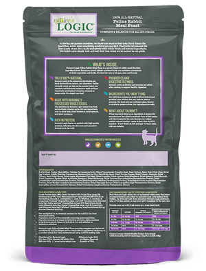 Nature’s Logic Feline Rabbit Meal Feast provides complete and balanced nutrition for All Life Stages and is comparable in nutritional adequacy to a product which has been substantiated using AAFCO feeding tests.