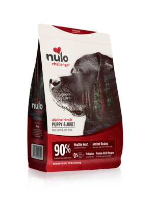 Nulo Challenger™ Alpine Ranch Puppy & Adult Beef, Lamb, & Pork Recipe Dog Food is formulated to meet the AAFCO Dog Food Nutrient Profiles for all life stages, except for growth of large size dogs (70 lb. or more as an adult).