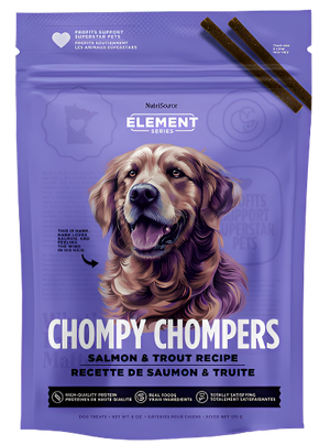 - NutriSource Element Series Salmon & Trout Chompy Chompers are made with high-quality protein.