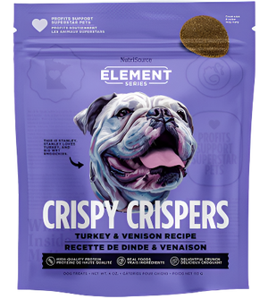 - NutriSource Element Series Turkey & Venison Crispy Crispers are made with high-quality protein.