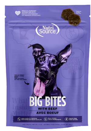 - NutriSource Beef Big Bites are made with high-quality protein.