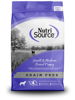 NutriSource Small & Medium Breed Puppy Grain Free Food is formulated to meet the nutritional levels established by the Association of American Feed Control Officials (AAFCO) Dog Food Nutrient Profiles for all life stages including growth of large size dogs (70 lbs. or more as an adult).