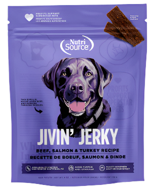 - NutriSource Beef, Turkey & Salmon Jivin’ Jerky is made with high-quality protein.