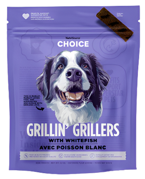 - NutriSource Choice Whitefish Grillin’ Grillers are made with high-quality protein.