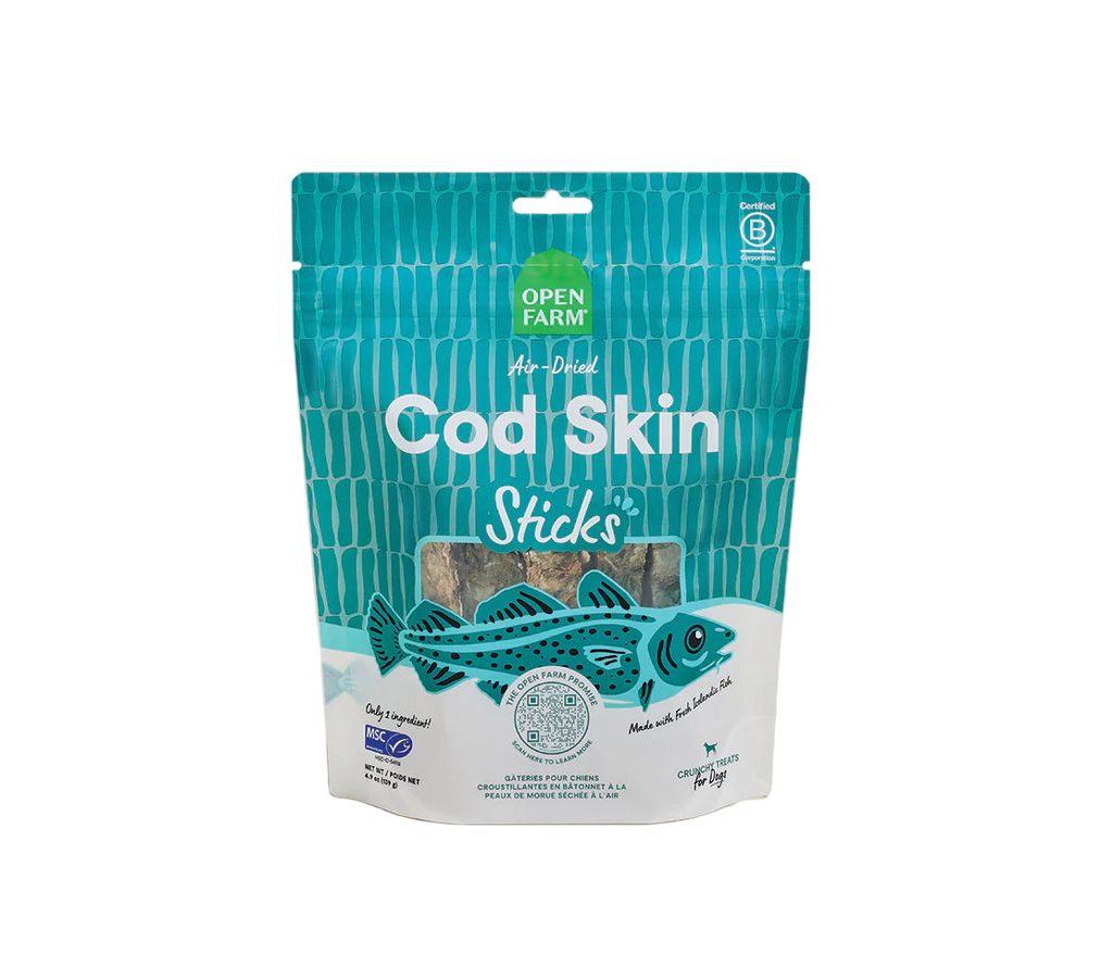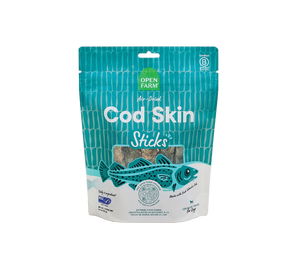 Our Cod Skin sticks are made with fresh Icelandic MSC certified wild-caught cod skins gently air dried to deliver an irresistibly crunchy treat packed with nutrients. This single ingredient crunchy treat is packed with protein, with Omega-3 fatty acids for healthy skin and coat, and will keep your pup busy with a delicious treat. Crafted in a human-grade facility with 100% human-grade ingredients, this grain-free treat is free from artificial flavors, colors, and preservatives.