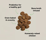 What makes our biscuits better? Our chicken & oatmeal recipe treats are made with humanely-raised chicken as the first ingredient and are combined with superfoods like pumpkin & sweet potato to deliver a crave-worthy taste. These treats are gently oven-baked for a crunchy treat, packed with probiotics to support a healthy gut, and infused with bone broth to support healthy digestion, making them a perfect reward for your pup!