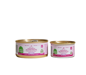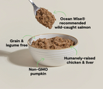 This velvety smooth pâté is crafted with a protein-packed blend of Ocean Wise recommended wild-caught salmon, humanely-raised chicken, and chicken liver. Moisture-rich with broth and finished with non-GMO pumpkin, our pâtés can be served as a complete and balanced meal or mixed in to your cat's bowl at mealtime to maximize moisture and nutrition. Grain- and legume-free and formulated without carrageenan, corn, or soy.