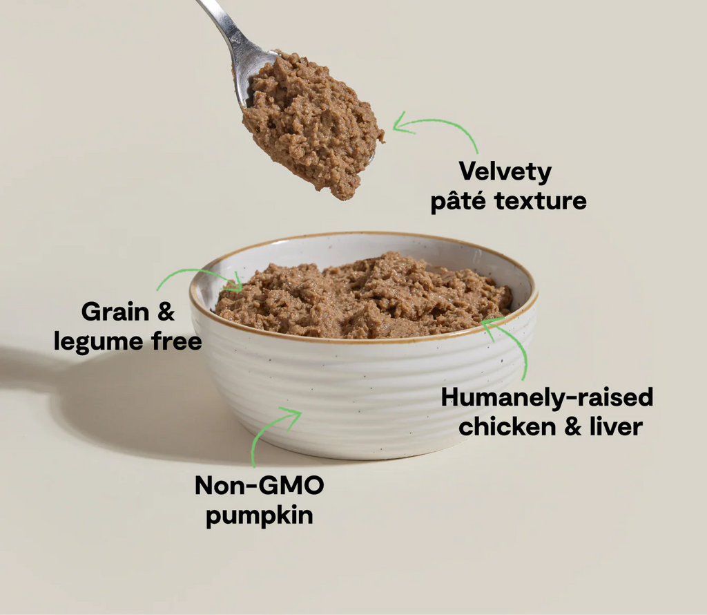 This velvety smooth pâté is crafted with a protein-packed blend of humanely-raised chicken and chicken liver. Moisture-rich and finished with non-GMO pumpkin, our pâtés can be served as a complete and balanced meal or mixed in to your cat's bowl at mealtime to maximize moisture and nutrition. Grain- and legume-free and formulated without carrageenan, corn, or soy.