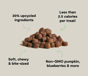 These bite-sized treats are made with high-quality non-GMO wholesome grains & fruits, like pumpkin and blueberries. With a soft and chewy texture and 30% upcycled ingredients, Be Good Bites are great for your pup and the planet too! Approximately 180 Treats per bag.