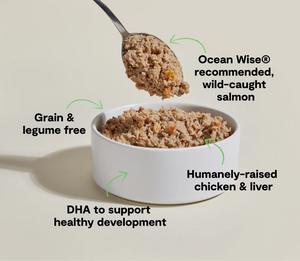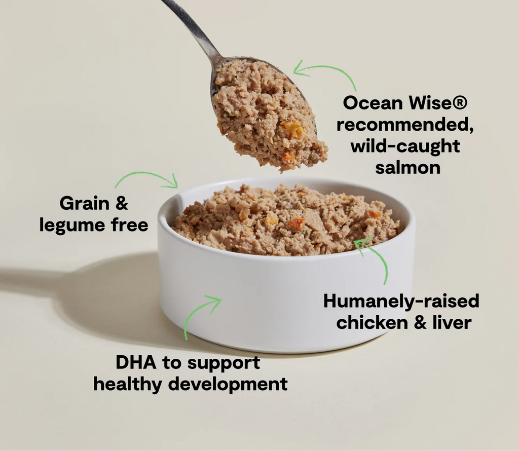 Formulated to give growing puppies the building blocks they need to thrive, this velvety smooth pâté is crafted with a protein-packed blend of wild-caught salmon, humanely-raised chicken, and chicken liver. Finished with non-GMO veggies and rich in DHA to support healthy growth and development, our puppy recipe can be served as a complete and balanced meal or mixed in with their meal to maximize nutrition. Grain- and legume-free and formulated without carrageenan, corn, or soy.