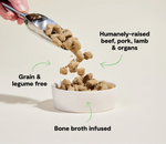Inspired by the wild, this freeze-dried blend of humanely raised beef, pork, lamb and organs gives your dog the protein-packed nutrition they naturally crave. This recipe features 95% meat, organ, and bone, along with organic, non-GMO fruits and vegetables – all coated in a tasty beef bone broth for a highly nutritious complete and balanced topper or meal.