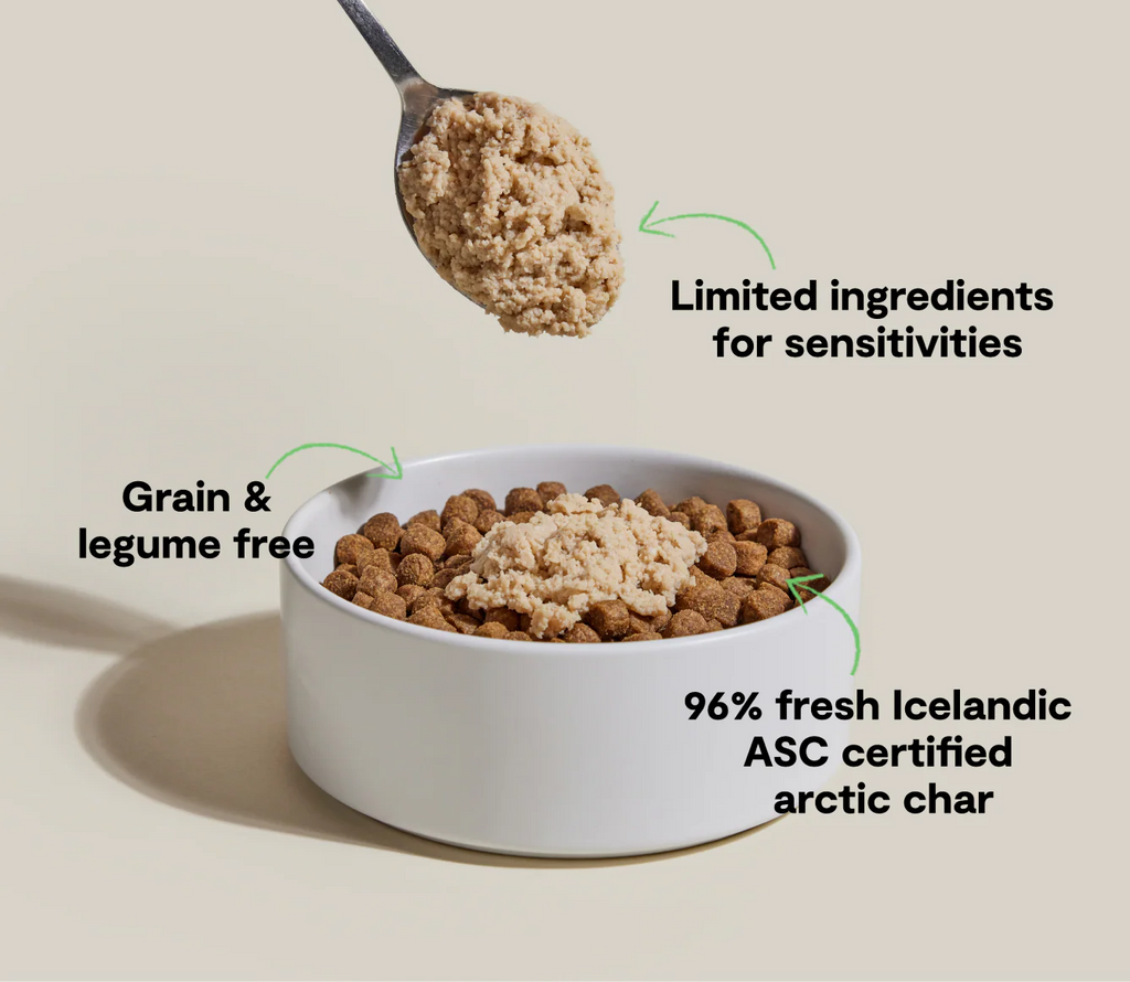 Crafted with 96% fresh Icelandic Arctic Char, this silky mousse is a delicious and nutritious way to add instant texture and variety to your dog's bowl. Grain- and legume-free and made in a human-grade facility with 100% human grade ingredients.