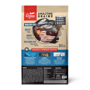 ORIJEN® Amazing Grains is packed with fresh or raw animal protein and enhanced with hand-selected grains to give your dog peak nourishment. With 90% premium animal ingredients, ORIJEN Original with Amazing Grains includes Whole Prey ingredients from free-run chicken and turkey, and wild-caught fish. These nutrient-dense animal ingredients provide your dog with the protein, vitamins and minerals they need to thrive. We’ve also added only the most amazing grains in a high-quality blend of oats, quinoa and chia and more, hand-selected to provide a balanced fiber ratio that helps support your dog’s digestive health. Nourish your dog completely with the amazing animal protein and quality grains found in ORIJEN Amazing Grains.