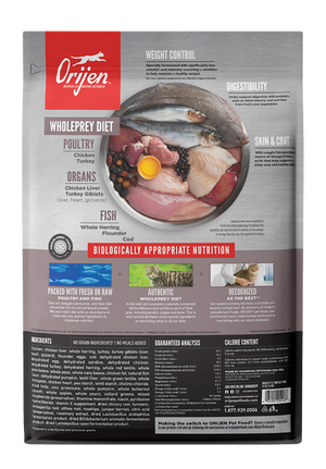 ORIJEN products are made in small batches from ingredients that are natural and about half of the ingredients arrive fresh each day. ORIJEN does not use chemical preservatives or artificial coloring. The amount of fresh meat that is used, give the kibble a unique shape, smell and color. There are added protein sources to each formula to give more taste and nutrients to the formulas. Fresh meats are low in calcium and phosphorus, which helps make each formula balanced.