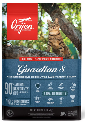 Give your kitty the meaty nutrition she craves with ORIJEN GUARDIAN 8 Dry Cat Food, Grain Free Cat Food for Adult Cats, With Chicken, Salmon and Rabbit. This dry cat food kibble recipe is made with up to 90% animal ingredients, for a biologically appropriate meal that your drive your cat wild. As an ancestral carnivore, your kitty needs a diet packed with protein, which is why this food always starts with five fresh or raw poultry or fish ingredients, including chicken, wild-caught salmon and rabbit. Wildly flavorful and packed with essential protein, vitamins and minerals, the recipe includes WholePrey ingredients like organs and bone to mimic what your cat’s ancestors ate in the wild. Formulated for adult cats at all life stages, this grain-free formula helps support immune function, digestive health, healthy skin and coat, muscle maintenance, heart health, joint health, brain and cognitive function, and eye health. Nourish your feline friend as nature intended and watch her come running at every meal!